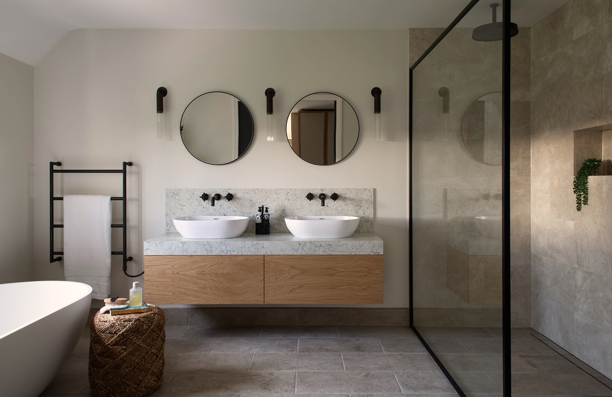 Landmark Pure in City Bronze plays a leading role, too, in the luxurious spa-like master bathroom. The generous space was designed to offer a clean, calm and relaxed ambience showcasing natural materials. Simplicity is celebrated with a palette rooted in neutral tones and a pared-back aesthetic. Mindful of the clients’ preferences and working with the architect’s plans to plot the key areas, Gemma tweaked the plans to craft a scheme where everything fits and is perfectly positioned. The contemporary freestanding bath encourages indulgent soaking and is thoughtfully placed in front of the window, with a generous walk-in shower opposite, while the bespoke vanity featuring his and hers basins is positioned on an uninterrupted wall so that mirrors could hang above it. This also provides an attractive sightline from the master bedroom next door.