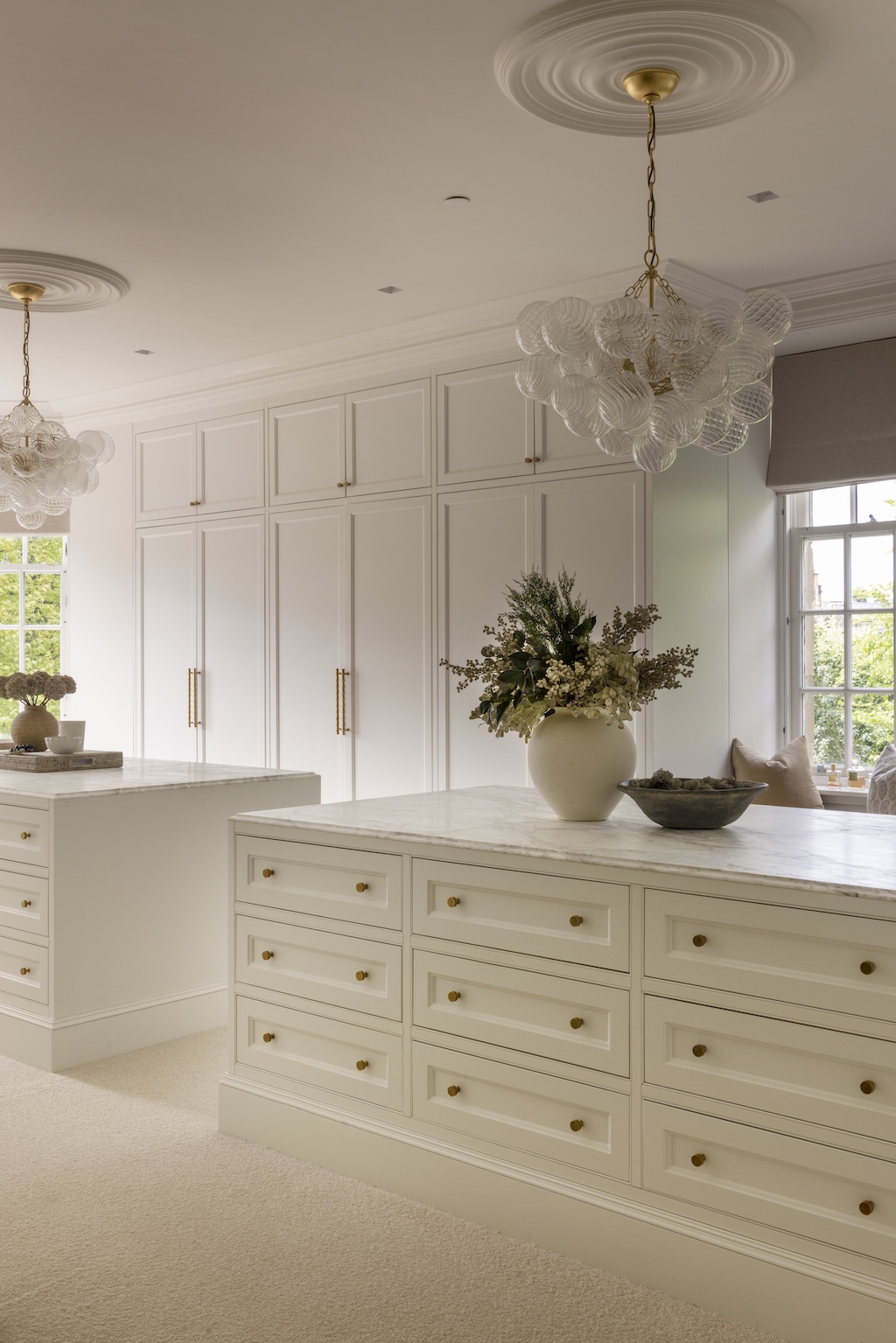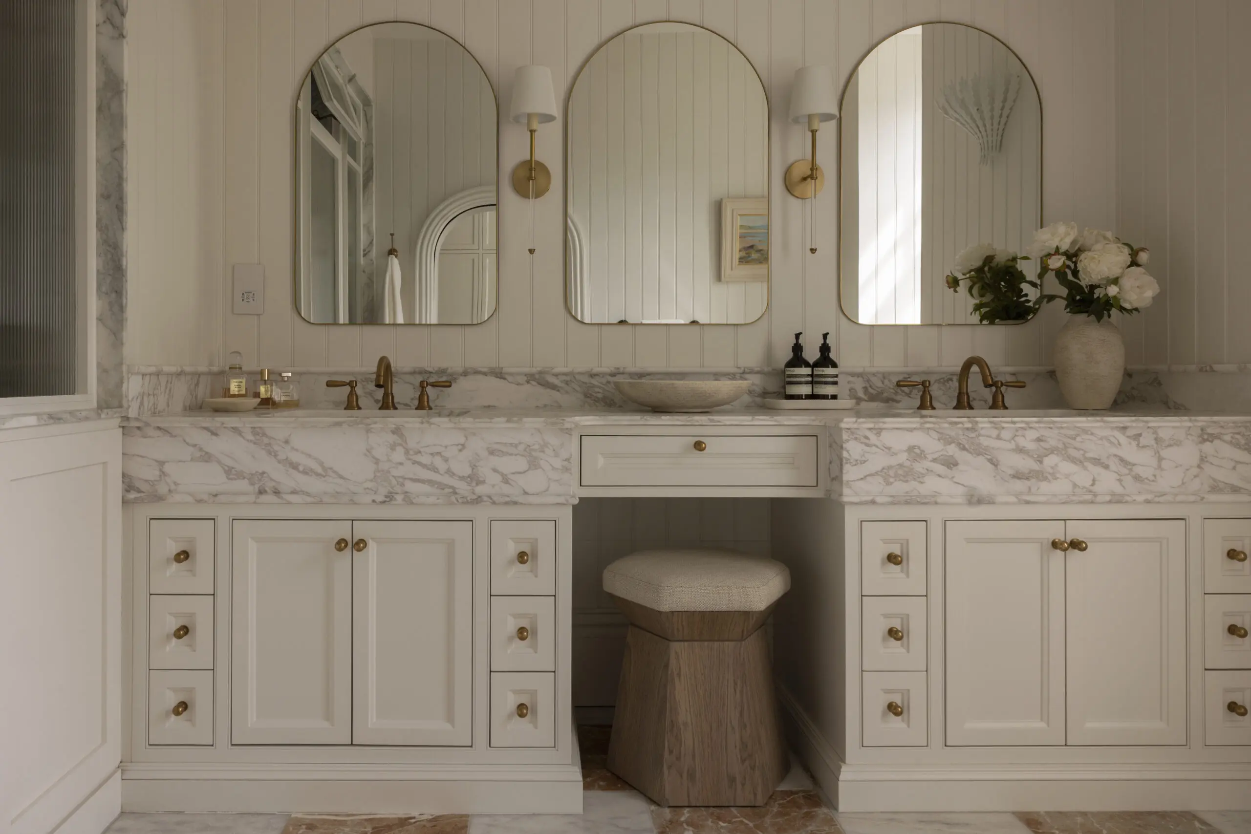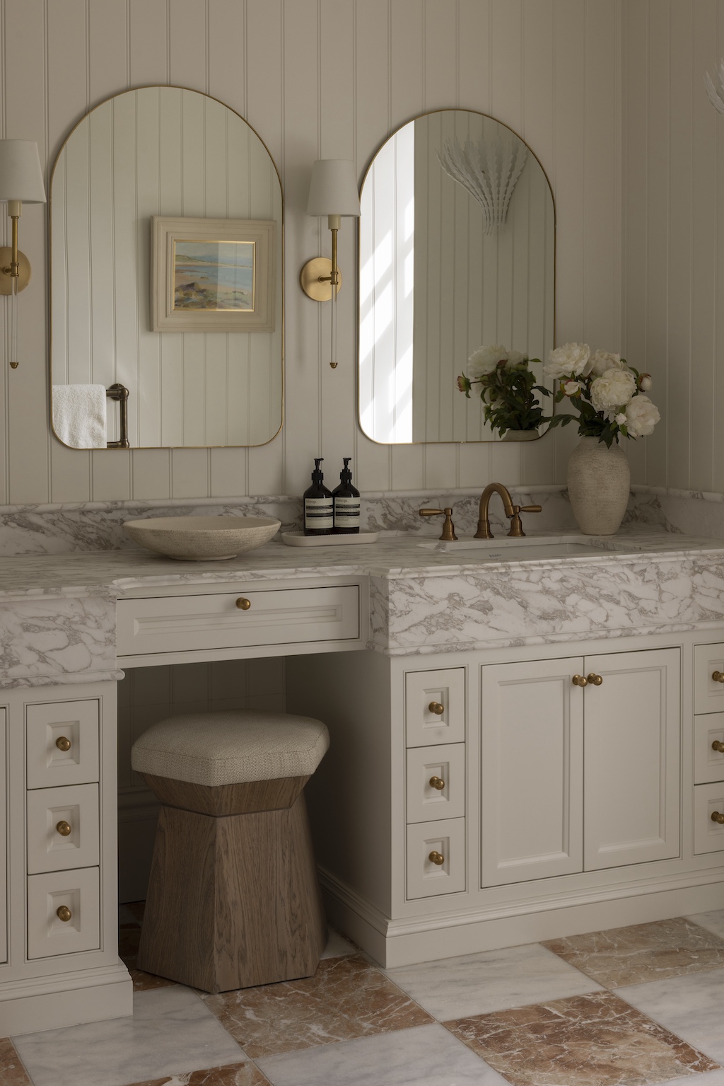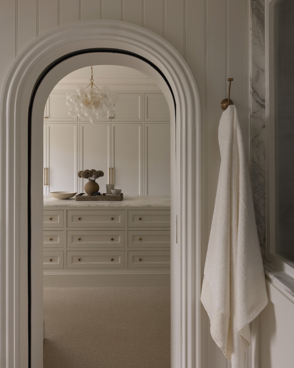 In the master ensuite, the scene is set by a romantic curved doorway that softens the transition from dressing room to bathroom, enhancing architectural flow. “The arch gives the space a more curated, designed feel, echoing classical proportions and adding a subtle sense of grandeur,” notes Bramhill.