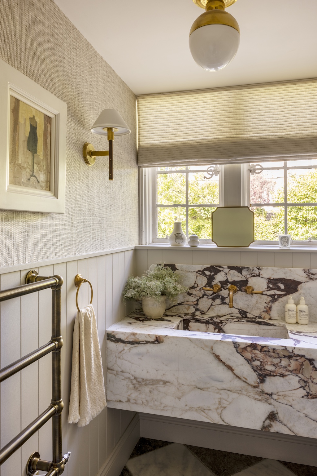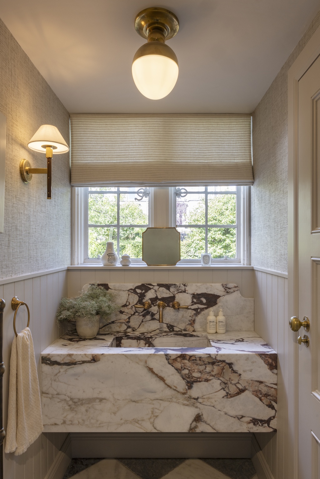 Designed to maximise both storage and visual impact, the ground floor WC introduces itself with a chic, bespoke Viola marble sink that spans wall-to-wall. Antique brass detailing enhances the depth and warmth of the room, with the Fairfield basin filler and a coordinating natural towel ring providing tasteful finishing touches. “The warm Viola marble, paired with antique brass detailing, created a rich and elegant contrast that elevates the overall design,” says Bramhill. “The warmth of brass and gold makes the interiors feel inviting and lived-in, balancing elegance with comfort.”
