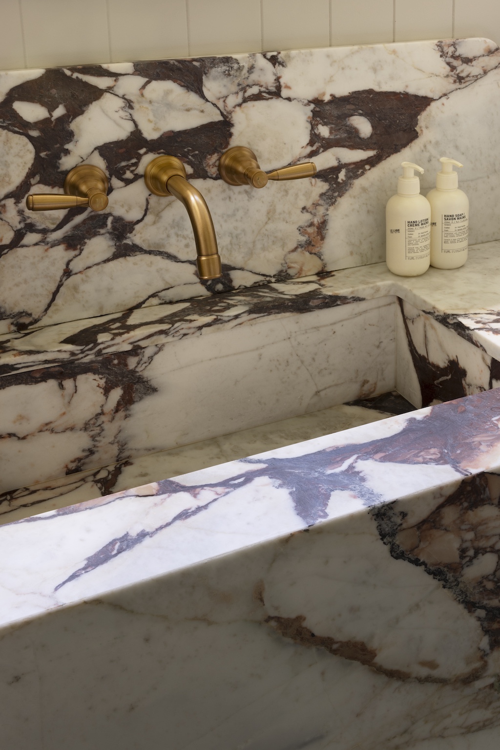 The Fairfield basin tap, crafted entirely from solid brass, is defined by its curved silhouette and gently barrel-shaped controls. Inspired by the Arts and Crafts movement of the Victorian era, its design embodies timeless character and meticulous craftsmanship while remaining relevant to this modern interior. Marble chequerboard floor tiles also nod to the property’s heritage, their geometry reinterpreted with a fresh edge.