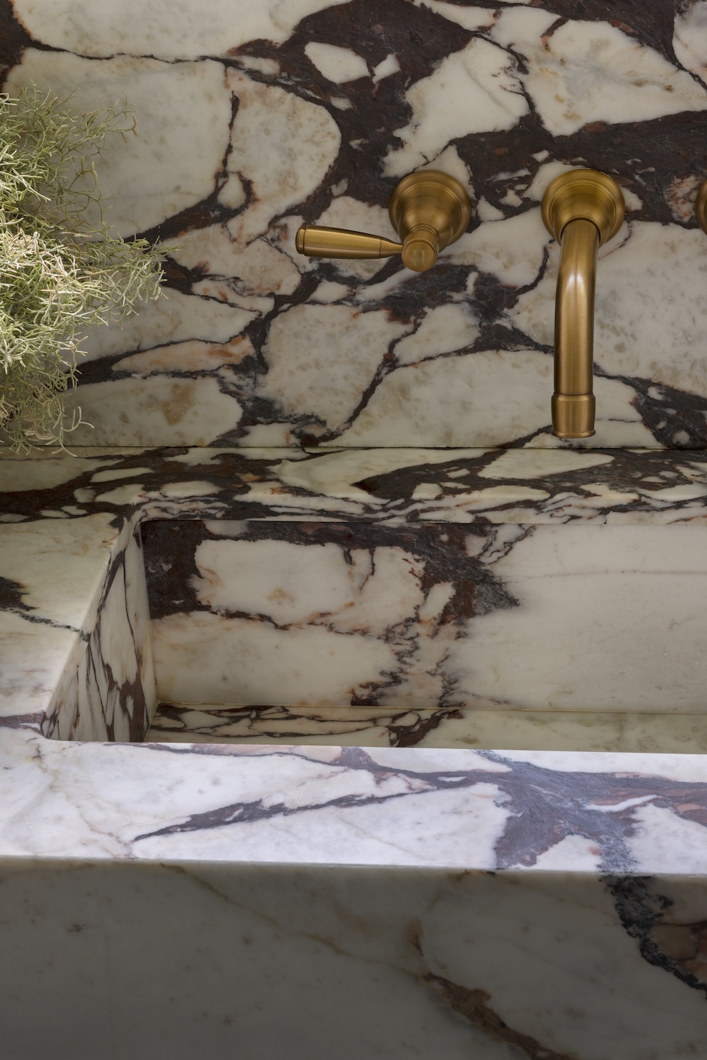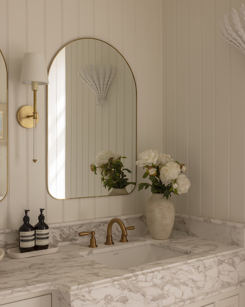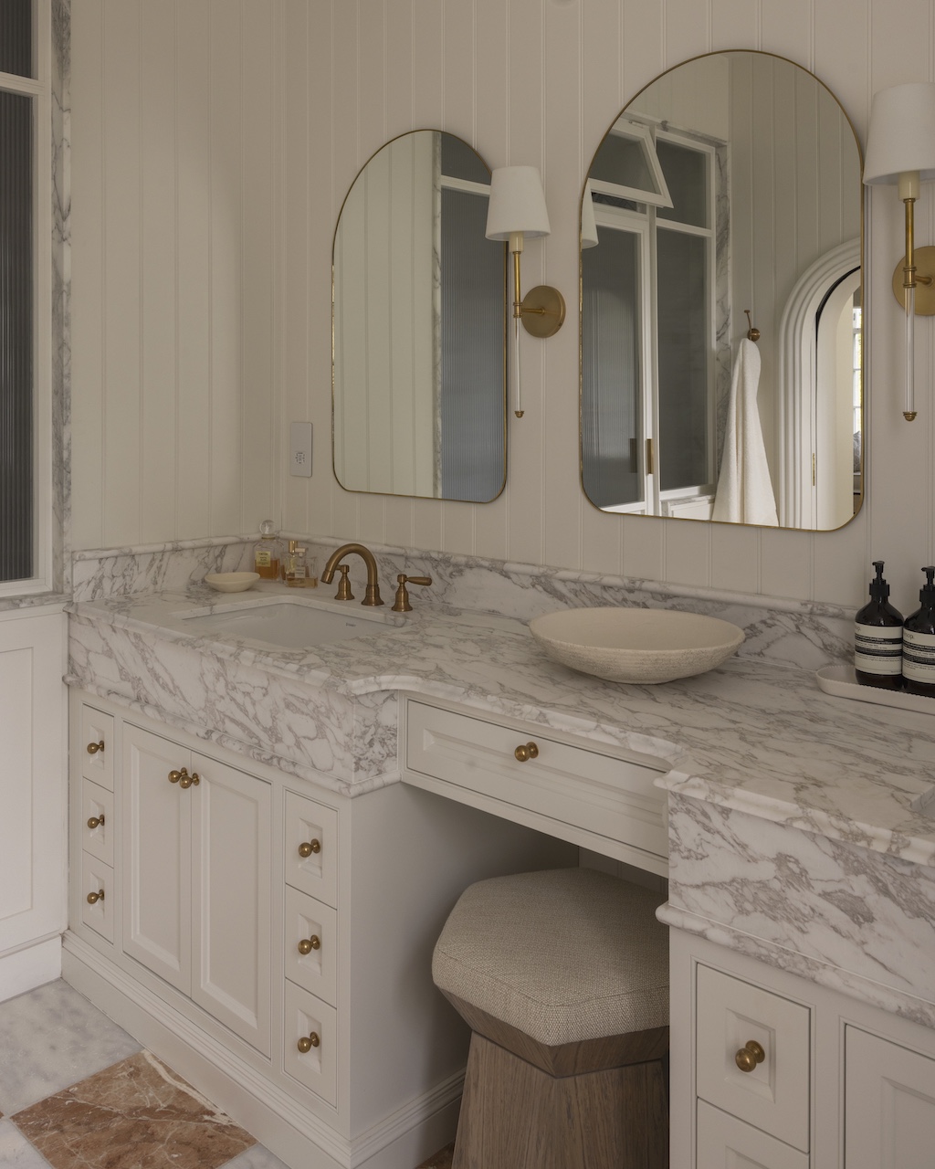 Layered marbles bring depth and texture, complemented by the warmth of antique brass hardware. Lighting from Visual Comfort and carefully sourced mirrors complete the scheme, blending classic and contemporary styles and reinforcing a sense of calm, elegant luxury.