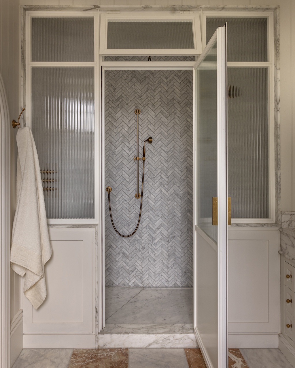 The serene ensuite also features a concealed shower enclosure, designed to create a clean, seamless look, while a marble bench introduces comfort and a spa-like atmosphere. “By hiding the functional elements, the space feels calmer and more refined, allowing the architectural details and finishes to take centre stage,” adds Louise.