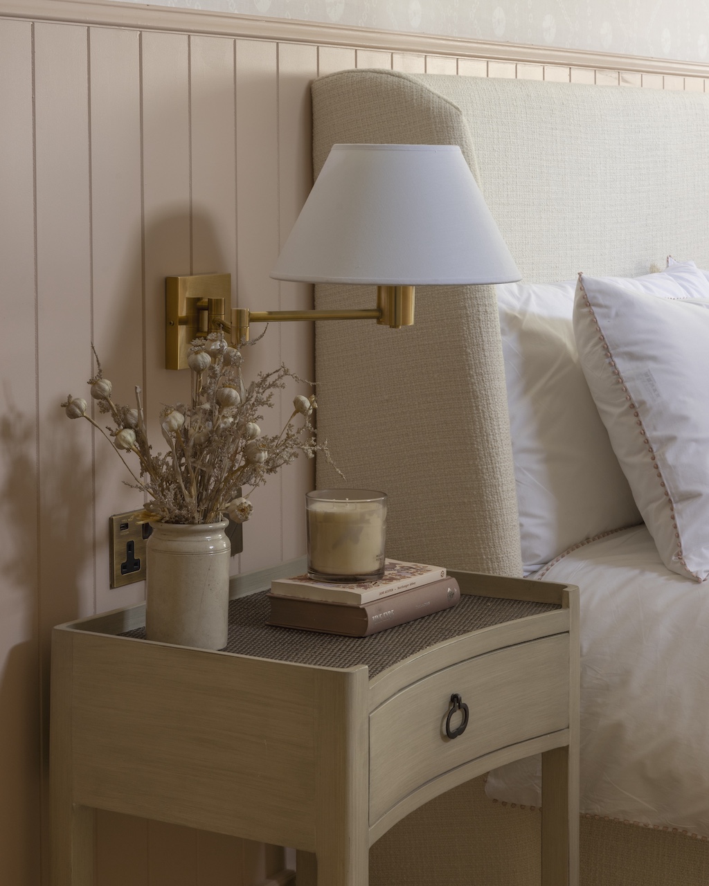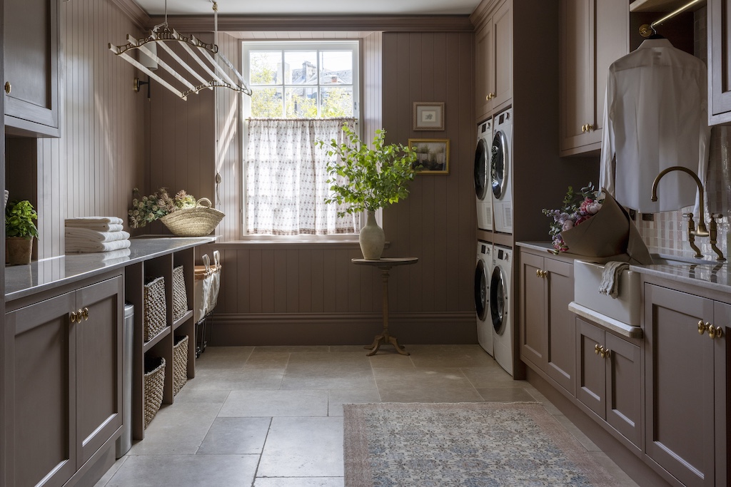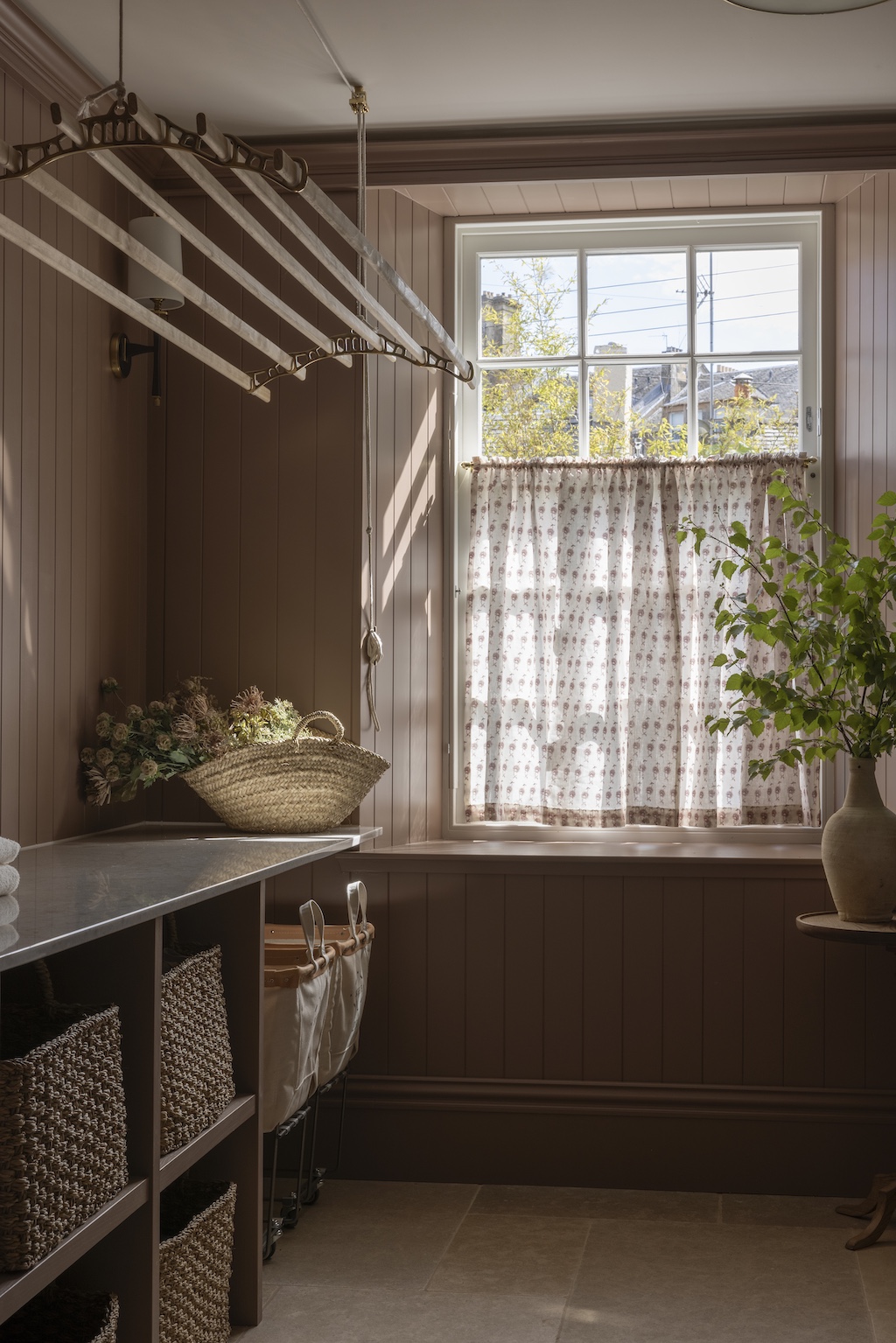 A light and airy palette provides the foundation of the interiors, layered with accents of blush pink, burgundy and chocolate brown. Colour is used to define the personality of each space – from the deep raspberry of Benjamin Moore’s Beaujolais in the boot room, to the softer Mrs Bouquet by Coat Paints in the utility room, and the moody atmosphere of the ground floor study.