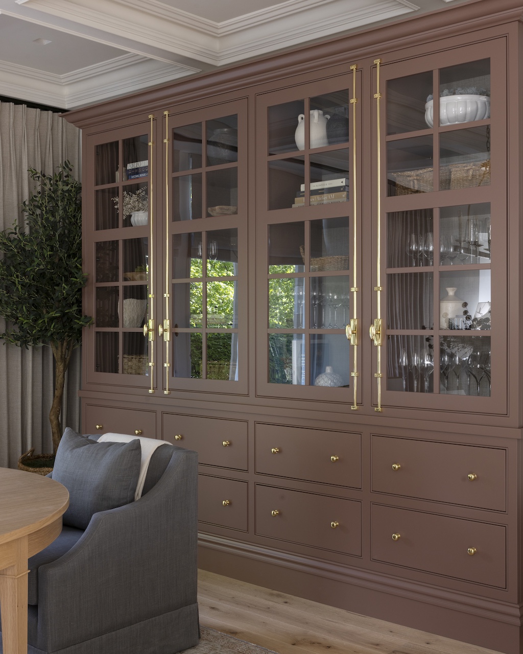 Gold and brass accents including cabinet hardware and light fixtures, add warmth and cohesion. Their subtle sheen complements both the soft neutrals and richer tones, enhancing the palette while contributing a sense of understated luxury.