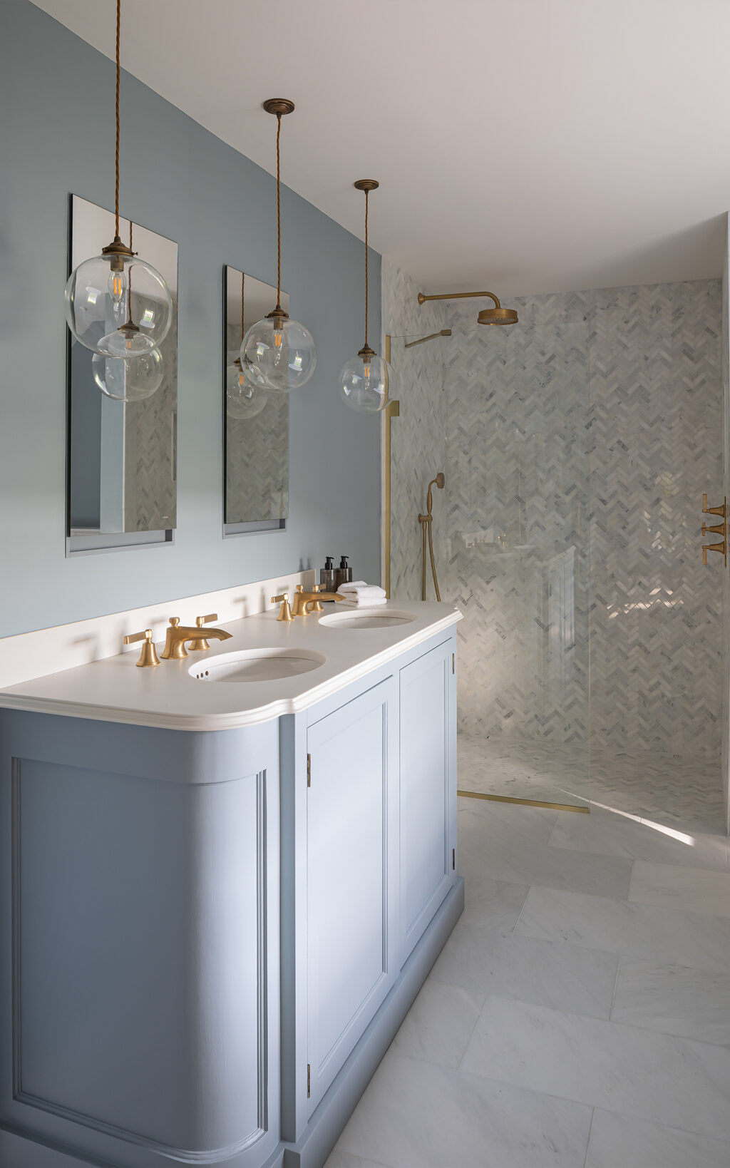 Each of the bathrooms were designed to be equally as show stopping as the living areas, while continuing to reinterpret country-house references. The master bathroom ensuite was inspired by the powder blue tones of Lewis & Wood blue patterned wallpaper, while Calcatta blue-cheese veined marble tiles nods to the traditional material palette. Style Moderne basin, bath and shower fixtures successfully break up heavy blue tones with a warm, brushed, non lacquered finish, that will gracefully age with patina.