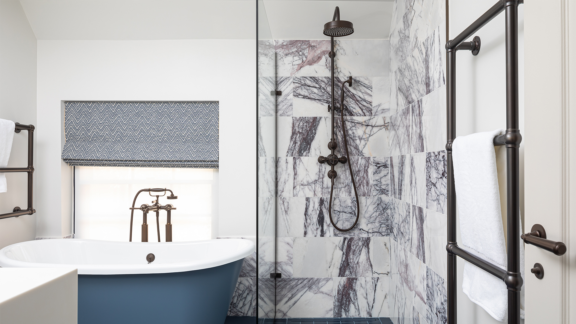 SGS Interiors Landale House Bathroom with Style Moderne Bath Filler and Exposed Shower