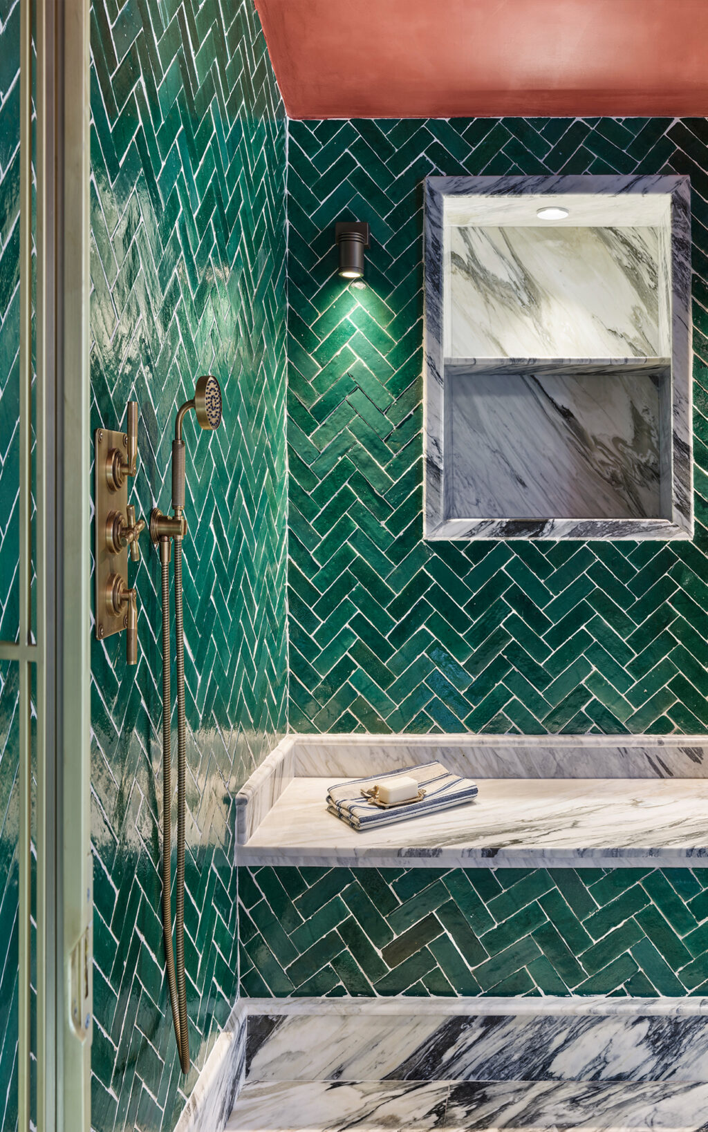 Landmark Industrial fixtures were selected for two bathrooms, while Style Moderne fixtures radiate Art Deco influence in the powder room. Designed with a bold and authoritative approach, these solid brass fixtures add strong design detail, while the Urban Brass & Non Lacquered finishes used across the bathrooms and additional powder room connect design integrity throughout the living space. Sanitaryware matching this cool metallic finish including a shower frame, basin legs and even cabinet hardware successfully ground the fantastical elements of the interiors with a demure, timeless narrative.