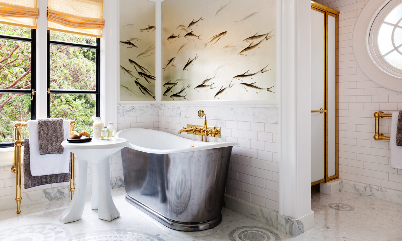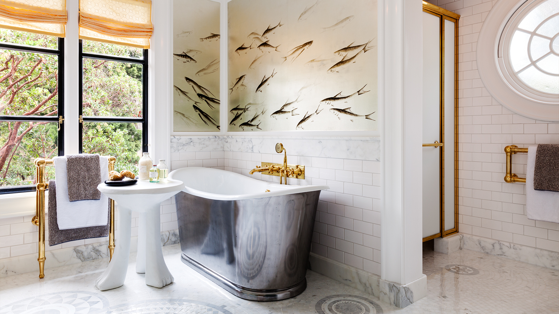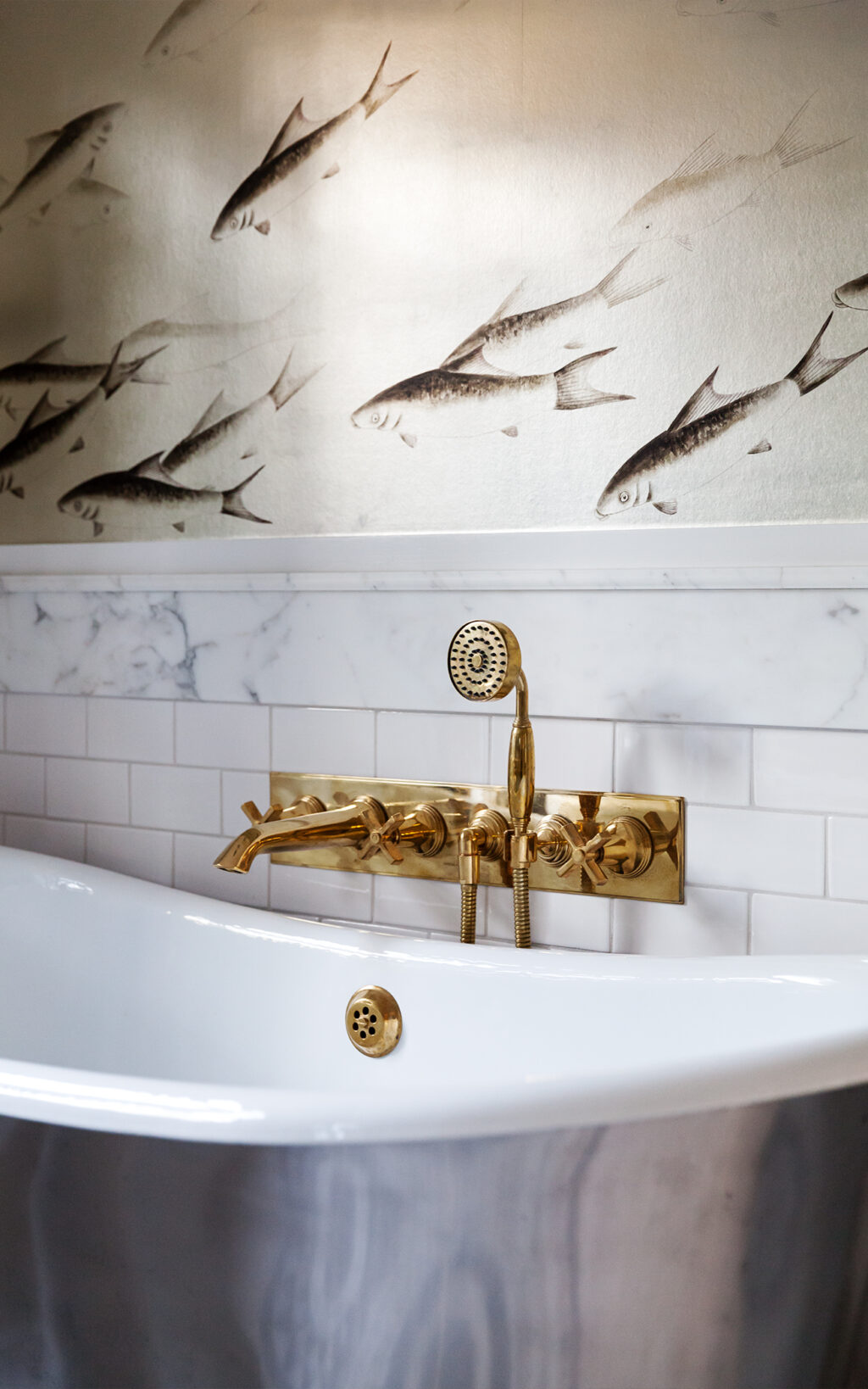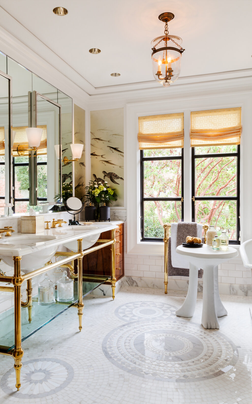 All the materials and finishes were selected with a goal,” says Deal, to create “a space that was sensitive to the character of the home, but fresh and original”. The twin vanity, for example, is framed by teak drawers with traditional panels however they are joined by brass framing which would not have happened back when. Similarly, a Sicis mosaic flooring is evocative of intricate 1920’s design, while its muted grey ‘drops on water’ pattern melts effortlessly into the surrounding décor. De Gournay ‘fish’ wallpaper adopts the same aquatic rhythm, featuring the custom addition of sea turtles which puts a new spin on a classic.