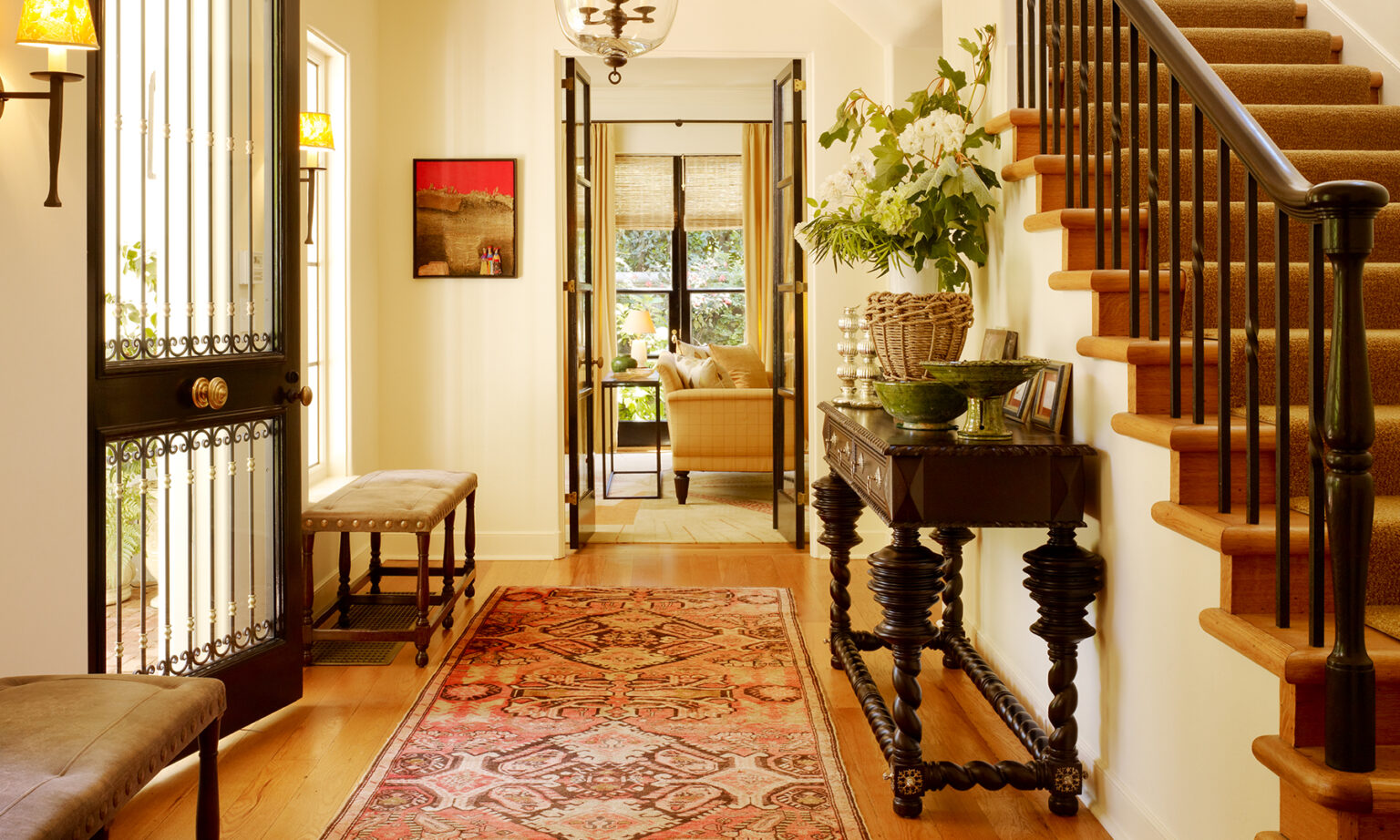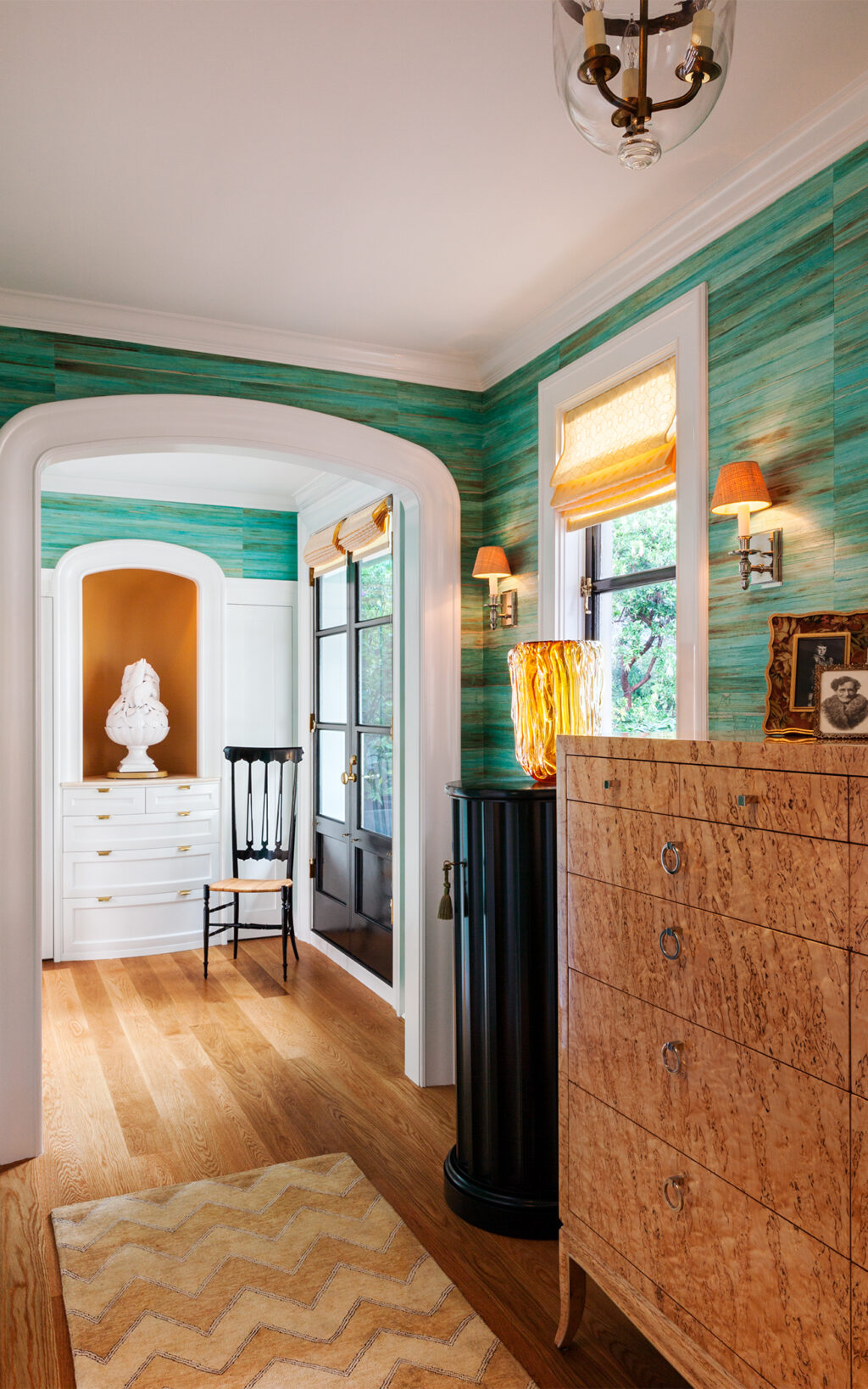 Besides some practical directions, the client gave BAMO full reign on the interior choices, which allowed the studio to create areas with unique identities. Within the living room, an antique fireplace replaces ill-proportioned millwork, which retains character while creating a comfortable gathering place. A dining room in a palette of rich wood, burnt orange and red travels into the hallway and stairs in Spanish Colonial fashion, before pausing at a turquoise green hallway which frames the master bathroom.